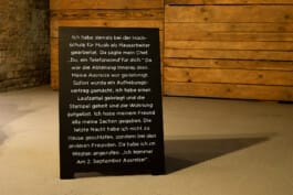 The main room features a light installation reminiscent of anti-tank obstacles accompanied by a quote from the East German writer Günter de Bruyn: “Die Gewöhnung konnte ich an mir selbst studieren. (I was able to study the process of getting used to it on myself).” This phrase seems to refer to his adjustment to the political and social situation in East Germany.